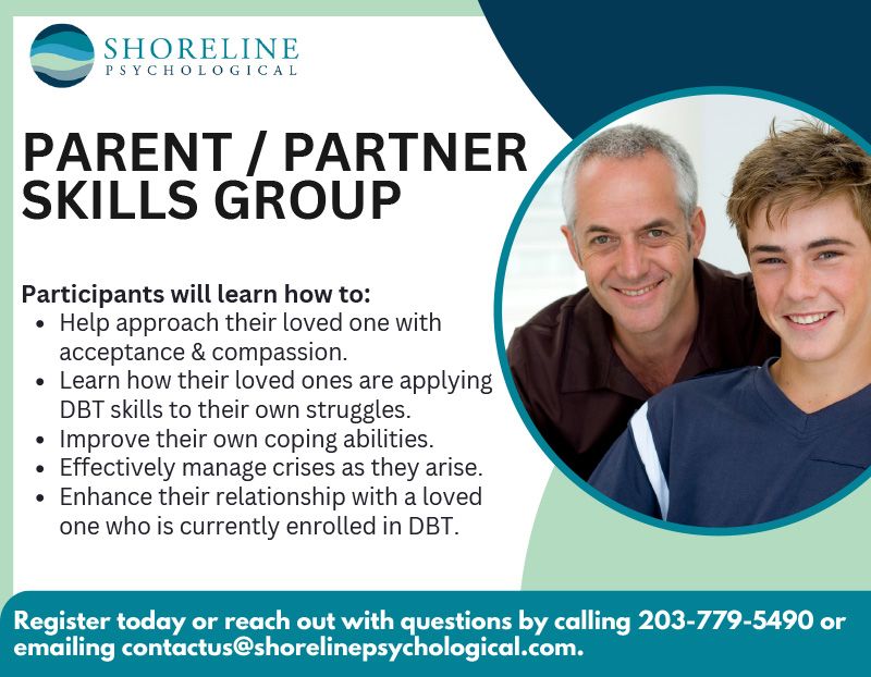 DBT Skills groups (for individuals, families, or partners)— designed to teach specific skills to address difficulties with regulating emotions, tolerating distress, impulse control, building and maintaining relationships with others. Click here to learn more about Dialectical Behavior Therapy (DBT). We offer skills training for adolescents and their caregivers, as well as for individuals in varying age categories.